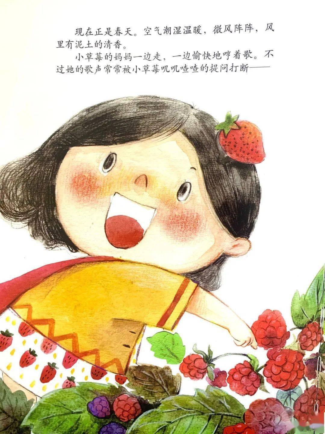 现在正是春天,空气潮湿温暖,微风阵阵,风里有泥土的清香,小草莓的妈妈一边走,一边愉快地哼着歌,不过她的歌声常常被小草莓叽叽喳喳的提问打断——